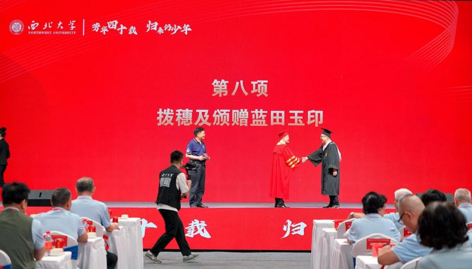 (中文系78级童飞作为校友代表接受校长郭立宏拨穗、校党委书记王亚杰颁赠蓝田玉印)