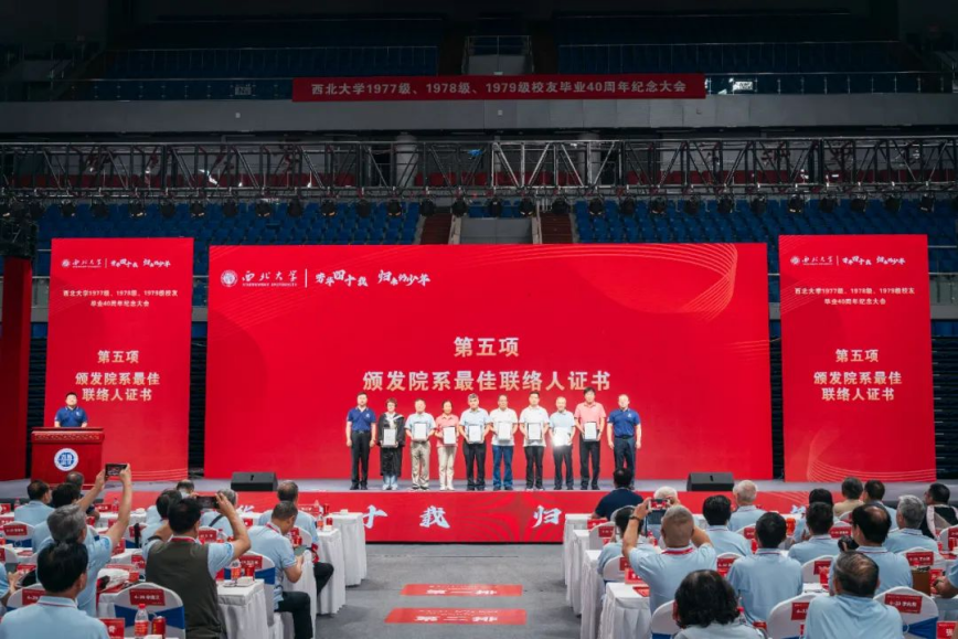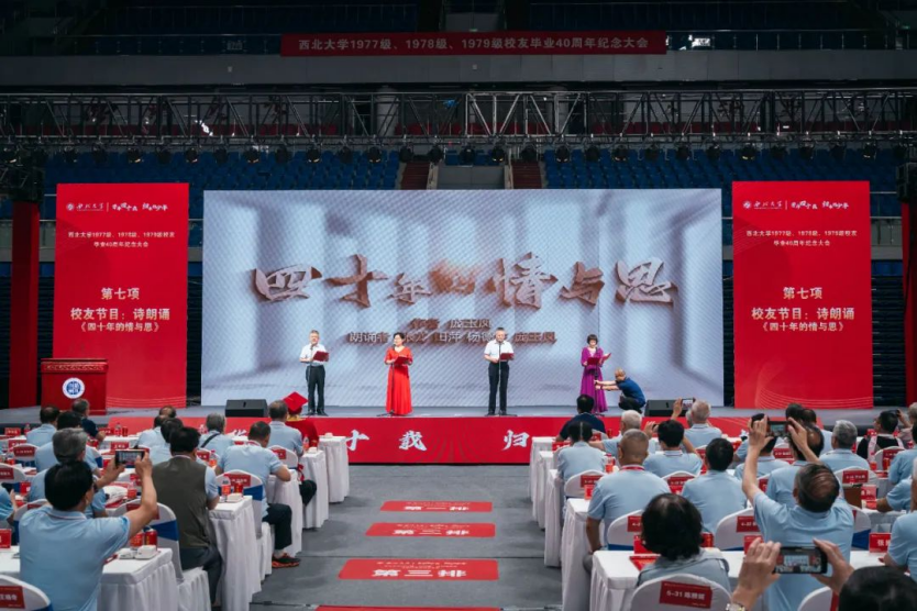 上午,院友们参加了由学校在长安校区万人体育馆举办的“西北大学1977级、1978级、1979级校友毕业40周年纪念大会暨第四届校友集中返校日活动”,并合影留念。中文系77级校友杨德生获校友“最佳联络人”称号。中文系77级校友葛岩作为校友代表发言。中文系78级童飞作为校友代表接受校长郭立宏拨穗、校党委书记王亚杰颁赠蓝田玉印。中文系79级校友马玉琛作为校友代表为教师代表薛迪之老师献花。院友代表朗诵了原创诗歌《四十年的情与思》,表达了对母校的款款深情,引起参会校友的强烈共鸣和热烈反响。