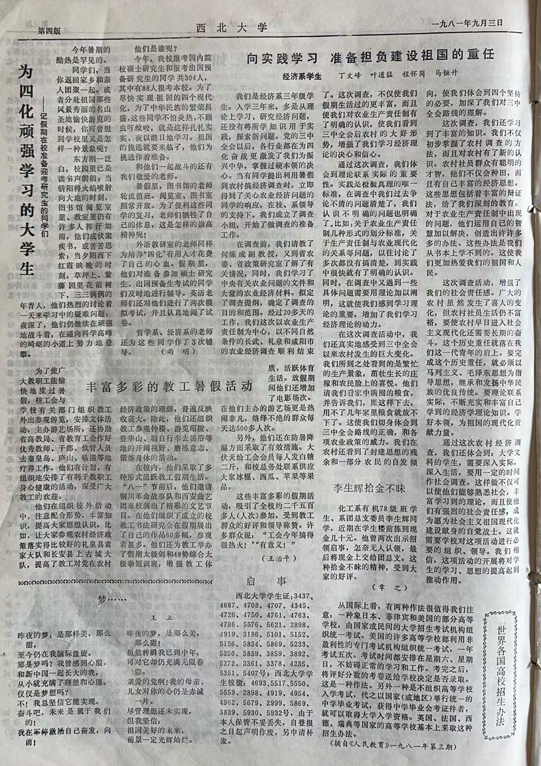 正是基于这样的理念,这样的付出,那些年西大的学生工作是做得有声有色,卓有成效。在以郭琦为首的校党政班子的坚强领导和大力推动下,学校各个层级与各个方面都十分重视做好新形势下学生的思想政治工作和管理工作,制定了“以三好为目标、以学习为中心”的学生工作指导方针,将培养德、智、体全面发展的“四化”建设人才作为一项战略任务来抓。学校成立了学生工作处(部)、德育教研室,先后制定和修订了《关于加强学生思想政治工作的几项决定》《关于开展创“三好”活动的决定》等加强和改进学生思想政治工作的文件,出台了《西北大学学生守则》《学籍管理规定》《生活管理规定》等制度,使学生工作扎实有序有条不紊地开展起来。为学生健康成长成才提供了强有力的思想导引、精神动力和制度保障。近日在捧读口述史的同时,我特地翻阅了1978年4月至1984年9月的西北大学校刊和《西北大学大事记》,从中看到了一些郭校长亲自抓学生工作的经典言论和生动事例,在此不厌其详展述如下,作为口述史这方面叙事的佐证与延伸。