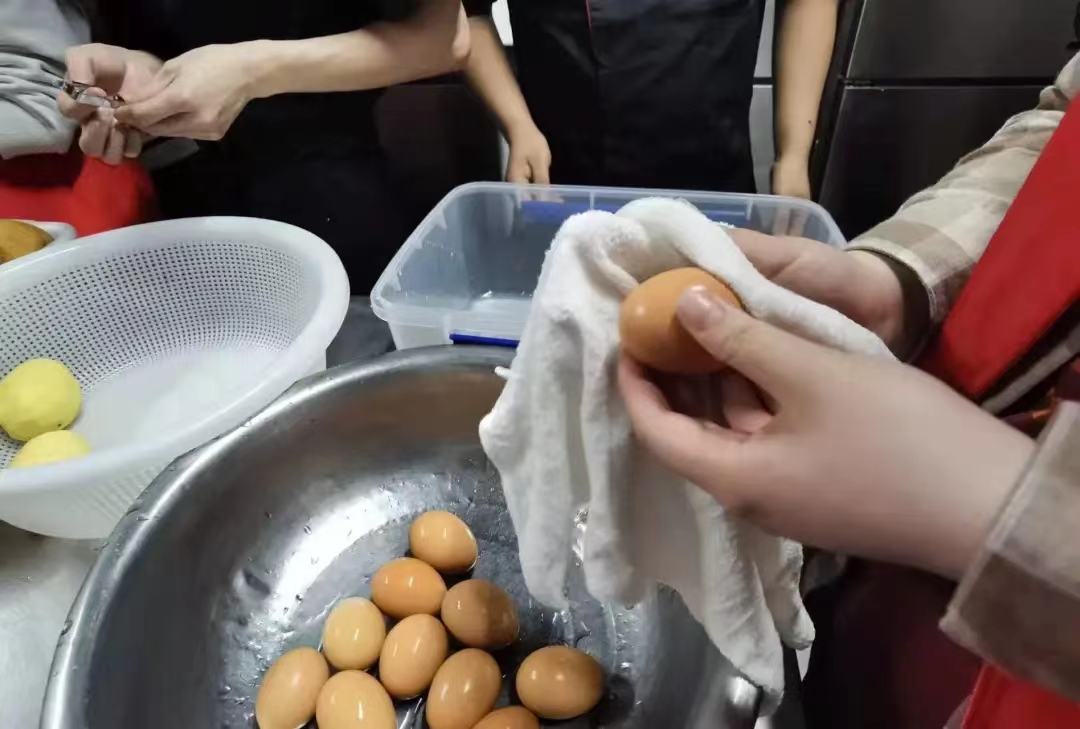接下来,就是同学们大展身手的时刻!大家被分为6组,戴上提前准备好的口罩、手套等工具,在6位食堂工作人员的带领下进入中餐区、西餐区的操作间,完成各类蔬菜的粗加工及鸡蛋清洗工作。