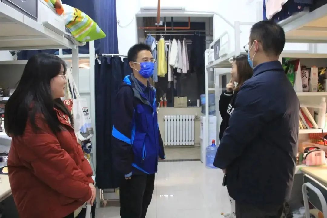 会后,院长谷鹏飞带领全体学工干部深入学生宿舍,就学生学习科研、体育锻炼、课余生活等方面进行了交谈,叮嘱同学们严格遵守学校疫情管理规定,及时反映问题,共同筑牢校园疫情防线。