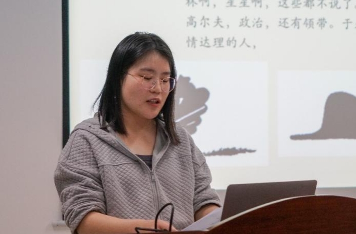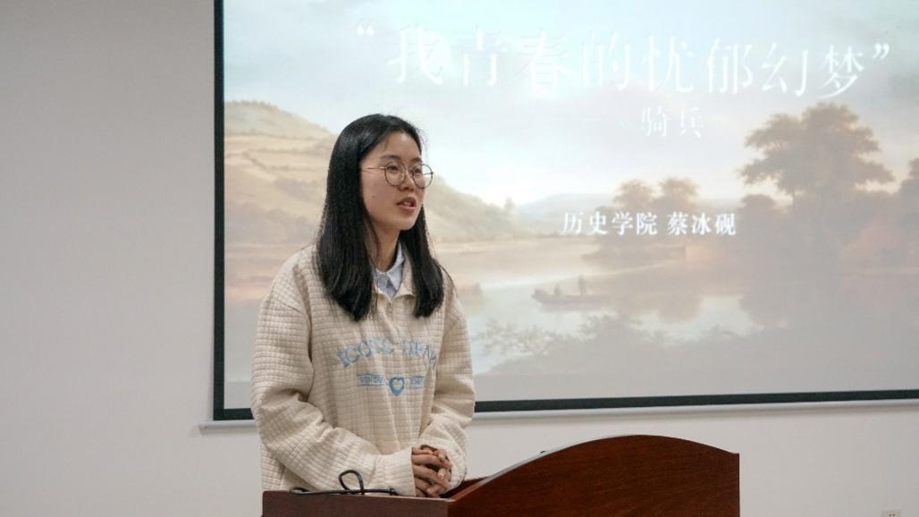 蔡冰砚同学以“我青春的忧郁幻梦”为主题,分享了苏童的《骑兵》一书。她从作家苏童谈起,指出苏童受江南文化影响,在南方“楚辞章句、四六骈赋”的文学想象上架构了一种民族志文学,同时苏童多病童年及历经的成长伤痛也在小说主人公左林身上呈现。