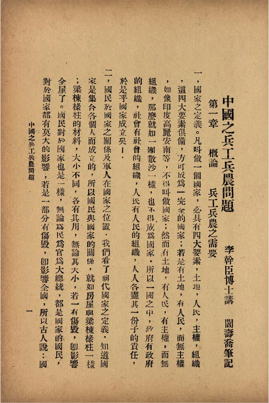 《中国之兵工兵农问题》 李幹臣博士讲;阎寿乔笔记