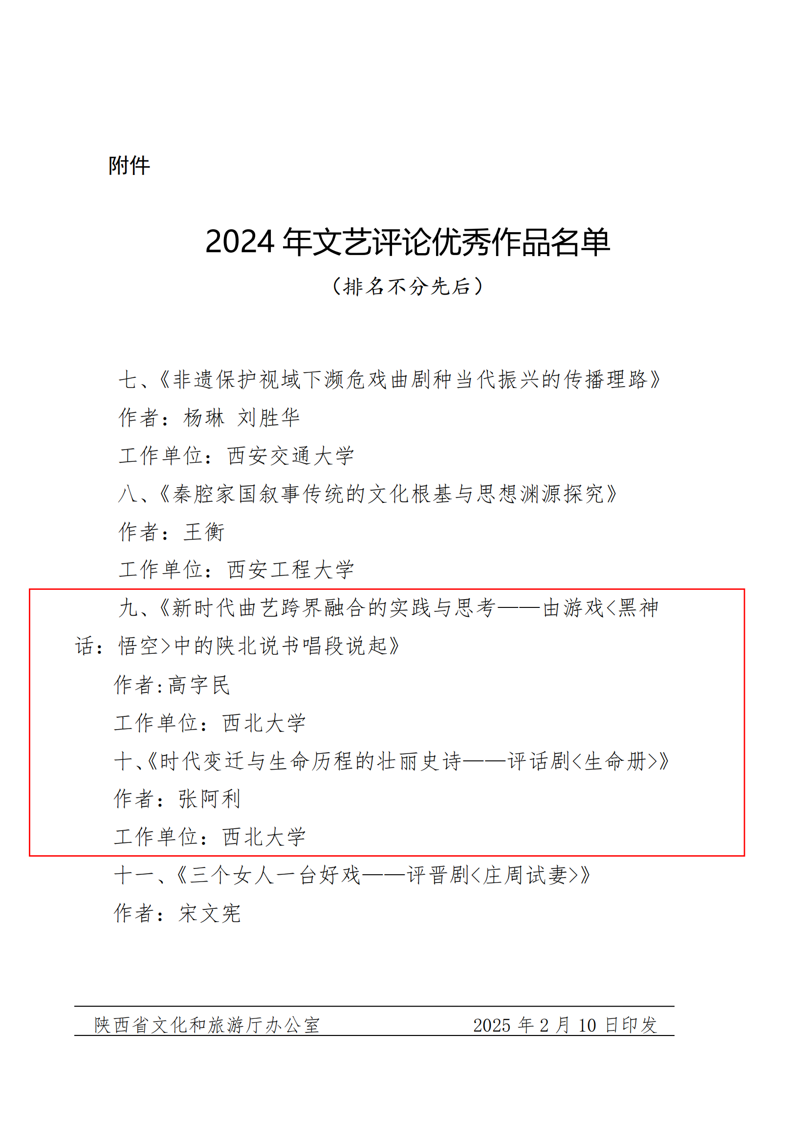 近日,陕西省文化和旅游厅公布了2024年文艺评论优秀作品名单。我院张阿利教授的《时代变迁与生命历程的壮丽史诗——评话剧<生命册>》和高字民副教授的《新时代曲艺跨界融合的实践与思考——由游戏<黑神话:悟空>说起》位列其中。