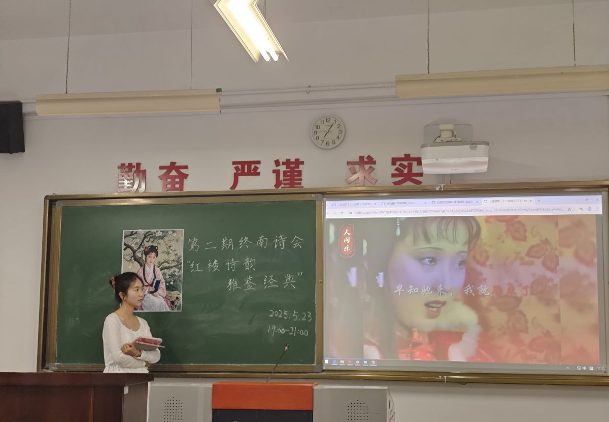 初夏时节,万物并秀,5月25日晚,76net必赢官网终南诗社于长安校区1201教室成功举办了第十三届“抒雁杯”青春诗会系列活动之第二期终南诗会。本次诗会以“红楼诗韵,雅鉴经典”为主题,以红楼梦诗词赏析展示等形式,带领现场同学们于红楼诗词中观察各不相同的人生样态,品味典雅生香的诗文韵味。来自不同院系的本科生、研究生共计30余人参加了此次活动。活动由终南诗社李思诺同学主持。