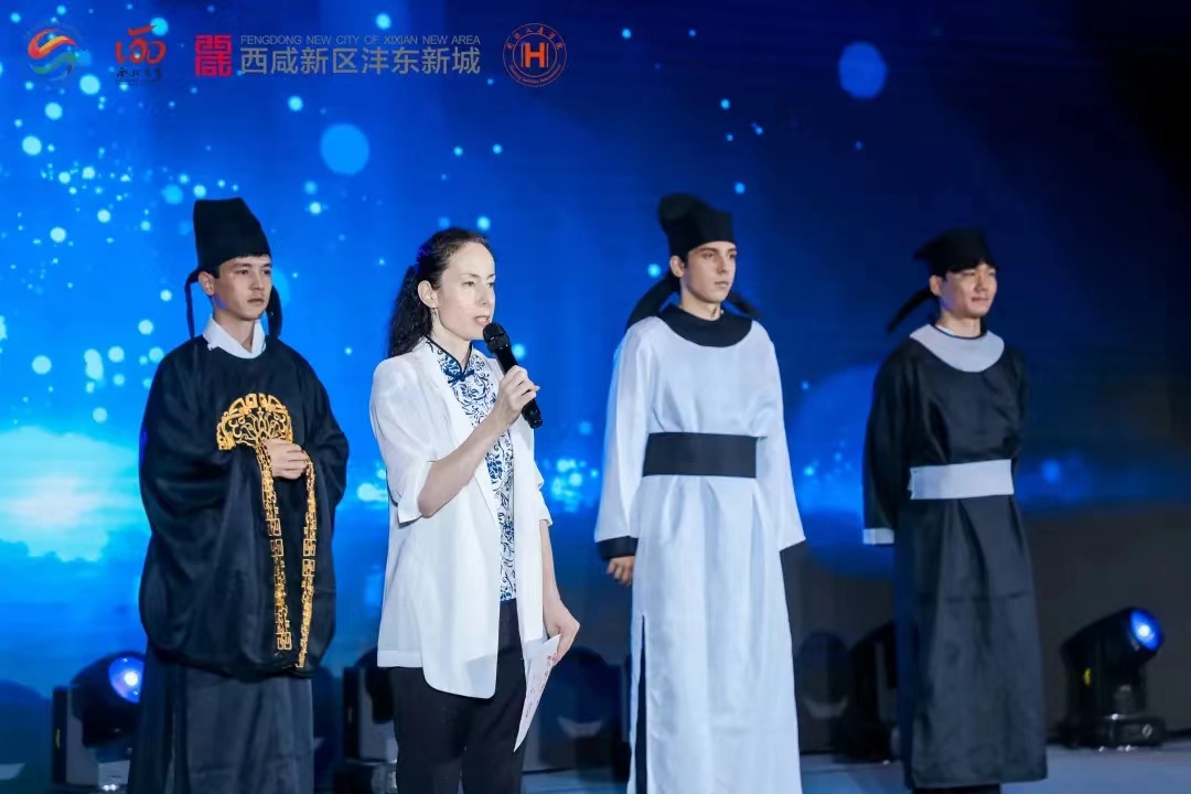 7月16日的演出,最具亮点的是西北大学教授考古学家王建新、美术家岳钰及旅居西安的法国学者美姗等专家在剧中客串亮相,以学者专家的身份,对剧中的丝路交流先贤进行了文化延伸式的阐发和提炼。
