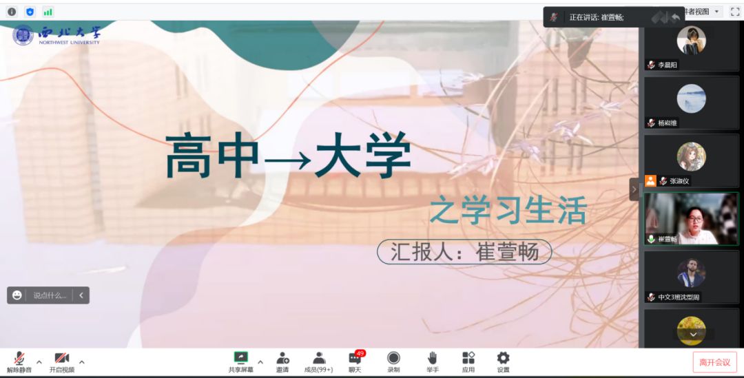 2020级汉语言文学专业本科生崔萱畅从高中到大学学习生活的转变入手,为同学们的学习方向提供建议。从目标的转变、思维方式的转变以及奖学金的获取方式三个方面介绍了高中与大学的区别。分享中,她认为进入大学后首先应当转变心态,认识到大学需要一个明确的目标并且为之努力,而不是靠家长老师的督促。她鼓励大家要提高自学能力,尽快找到适合自己的学习方法,提高学习效率;在保证学业的基础上,多参加社会实践和各项活动,增长自己的见识。