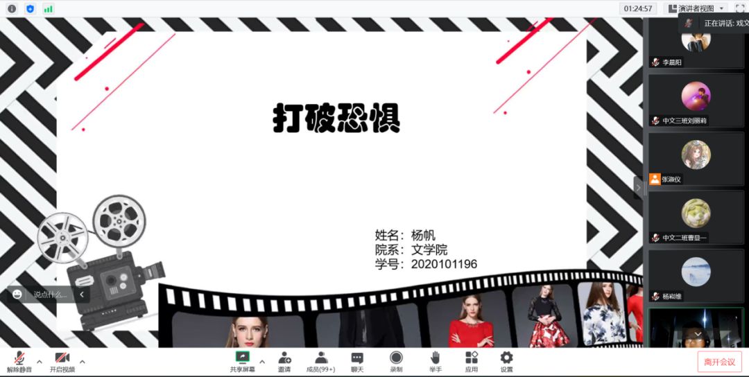2020级汉语言文学专业本科生张淑仪分别从学习生活与课余活动两方面进行了分享,她用自己的亲身经历向同学们分析了中学与大学时间安排的不同,并指出应当用认真的专业学习态度与丰富的兴趣爱好抵除自己内心的拖延与焦虑,在开放包容的环境中尽情享受自己的大学生活,以积极的心态面对未知境遇。此外,她还希望同学们能够扩宽眼界,多多表达自己的看法。