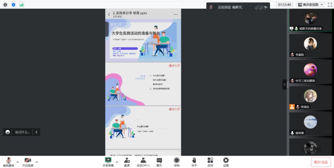 2020级戏剧与影视学硕士研究生杨慧主要结合个人参与“互联网+”“挑战杯”“创青春”等创新创业大赛的经历,向2022级新生介绍了竞赛制度、竞赛流程和竞赛意义,鼓励大学生充分调动自主学习的主观能动性和创新积极性,激发个人创意的活力。她在分享中谈到,参与社会实践和创新创业竞赛能够培养大家的人际沟通能力、团队合作能力和抗压能力,能够帮助同学们在大学阶段树立起正确的人生观、价值观和世界观,实现在大学校园里快乐学习、健康生活的目标。