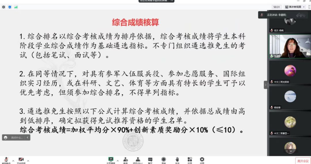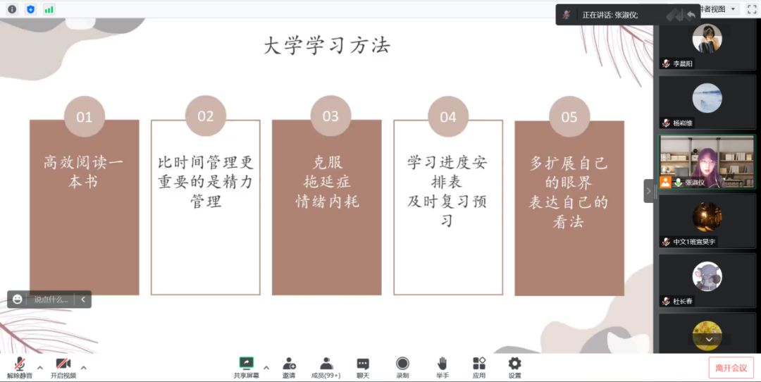 2020级语言学及应用语言学专业硕士研究生李晨阳根据自身经历主要向参会同学分享了大学生活规划和培养健康学习心理两部分内容,并与大家探讨了大一新生如何规划大学生活,怎样提早摆脱简单天真的学生思维、提高自己的竞争力这个问题。此外,她分析了大学生普遍存在的不健康的学习心理,为存在心理情绪困扰的新生提供了相关意见与建议。