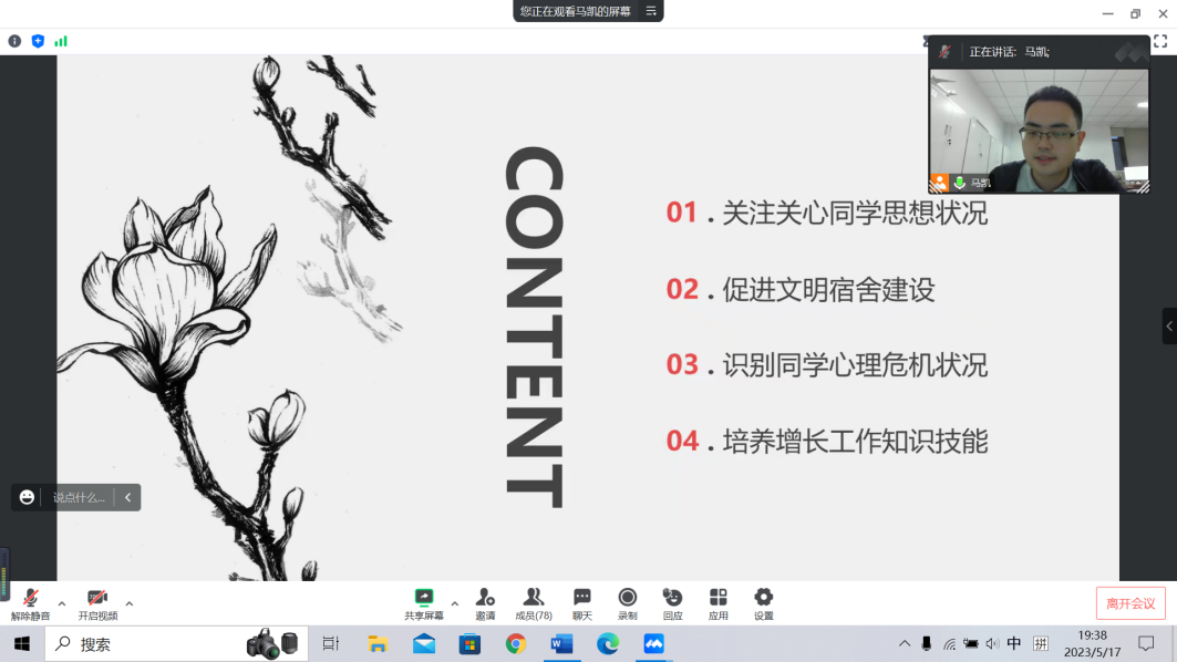为进一步加强心理健康教育,帮助和促进心理委员、宿舍舍长在工作中树立责任、增进知识、强化技能,切实发挥实效。5月17日晚,76net必赢官网二级心理辅导站开展了“阳光护航”心理育人宣传季系列活动——“蒲公英行动”第一期培训,本次活动由76net必赢官网心理专干马凯主讲,各年级学生心理委员、宿舍舍长参加。