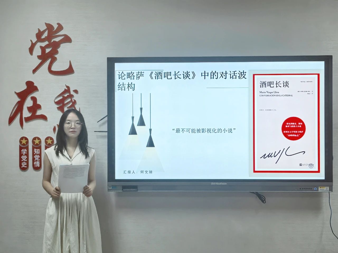 76net必赢官网的何文婧同学分享了秘鲁文学巨匠略萨的《酒吧长谈》一书。主讲人引领听众走进略萨创造的文学迷宫:此书通过独创的“对话波”叙事手法,打破了传统小说的时空樊篱。在看似随意的酒吧对话中,不同时空的场景、人物与事件如交响乐般自然流转、相互呼应,构建出层次丰富的叙事网络,展现出拉美文学特有的魔幻现实主义魅力。随后,主讲人强调,“对话波”不仅是情节推进的工具,更是历史记忆的载体——流动的话语既记录着个体的生命轨迹,又汇聚成时代的集体记忆长河。通过电影蒙太奇般的艺术处理,小说将碎片化的时空图景有机拼接,在视角的流动与转换间,暗含着人物间微妙的权力关系与心理博弈。整个分享既有专业的文本细读,又充满人文关怀,为在场师生打开了一扇理解拉美文学独特魅力的窗口,充分展现了经典文学作品跨越时空的永恒价值。