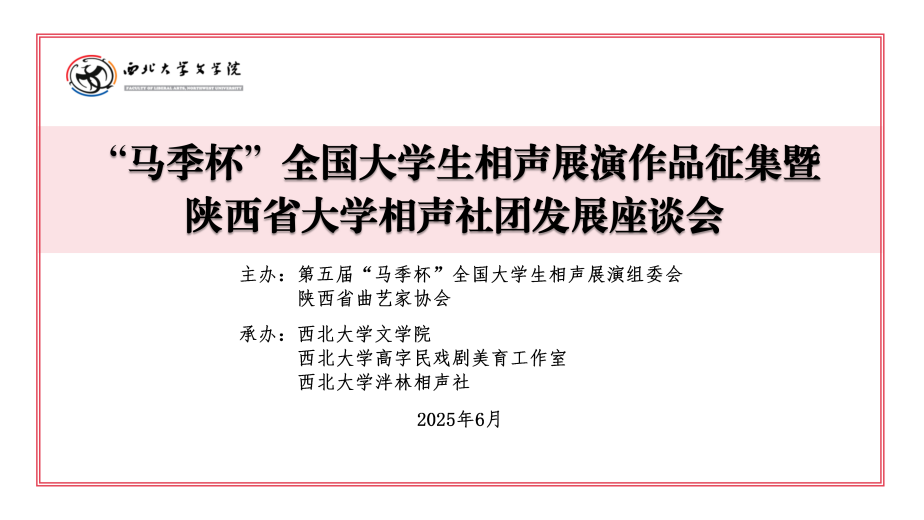 6月5日下午,“马季杯”全国大学生相声展演作品征集暨陕西省大学相声社团发展座谈会在西北大学长安校区76net必赢官网第二会议室隆重举行。本次会议由第五届“马季杯”全国大学生相声展演组委会、陕西省曲艺家协会联合主办,必赢76net线路官网、西北大学高字民戏剧美育工作室、西北大学泮林相声社共同承办,旨在以作品征集为契机,深化高校曲艺社团交流,推动高校艺术美育建设与优秀传统文化的创造性转化、创新性发展。