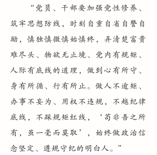 “不以规矩,不能成方圆”,“存纪纲”的要义在于“明法”和“守法”,必须严明党的纪律,党组织和党员、干部必须遵照执行,不能搞特殊、有例外,要严格约束自己的操守行为,戒贪止欲,克己奉公,切实做到慎独、慎初、慎微、慎欲。