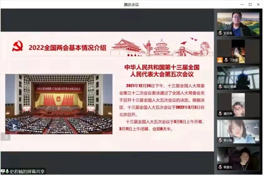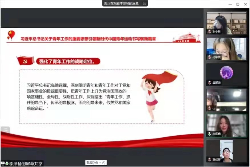 为献礼党的二十大,庆祝中国共青团成立一百周年,全面贯彻党的十九大和十九届历次全会精神,深入落实习近平总书记关于青年工作的重要思想,进一步筑牢我院团学干部的思想根基,3月23日下午,院团委邀请我校习近平新时代中国特色社会主义思想青年研习社成员面向我院全体团学干部开展了“喜迎二十大、永远跟党走、奋进新征程”线上主题教育活动。