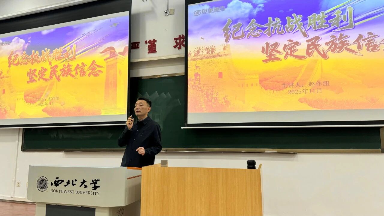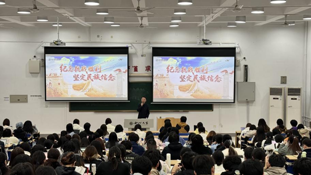 2025年11月13日,校党委副书记赵作纽为76net必赢官网2024级全体本科生讲授以“纪念抗战胜利 坚定民族信念”为主题的形势与政策课,教育引导学生铭记历史真相,传承伟大抗战精神,强化时代责任担当,厚植深沉家国情怀。