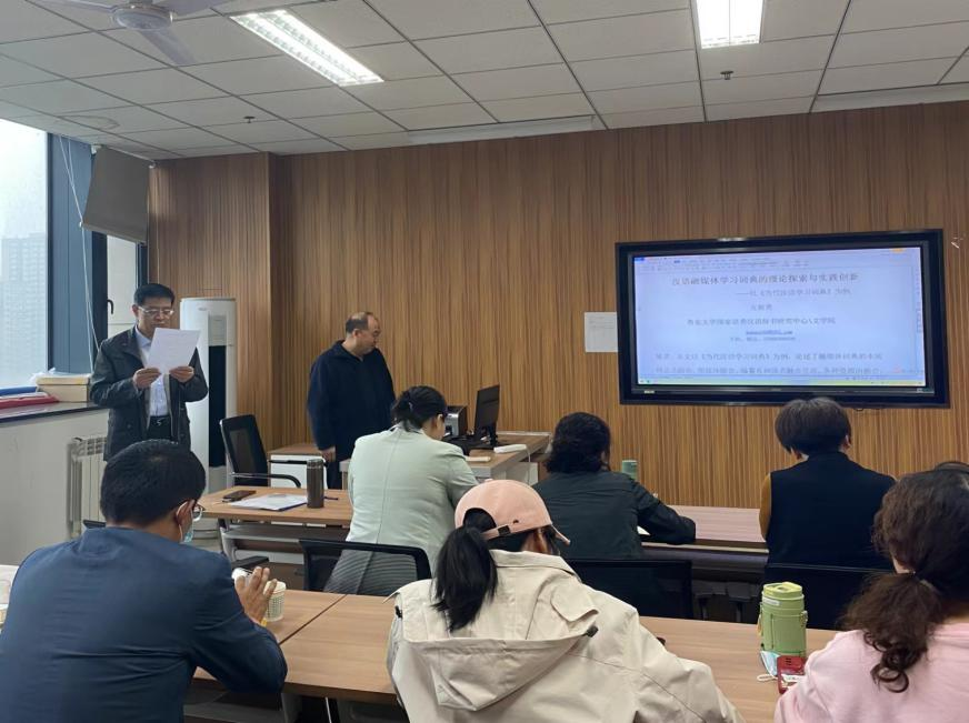 亢世勇教授首先用幽默风趣的语言,讲述自己与西北大学的关系。接着介绍学术研究情况。《当代汉语学习词典》是上海外语教育出版社的重点选题,是国家“十三五”重点出版规划项目,是他所在汉语辞书研究中心响应习近平总书记关于媒体融合发展的精神,推动融媒体与词典编纂结合的尝试。亢教授指出融媒体辞书的本质,介绍《当代汉语学习词典》的总体设想,说明词典的呈现形式为融媒体形式,载体分别为纸质词典、APP应用及网站等。